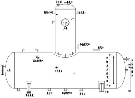 7、水箱:是由筒身和沖壓橢圓形封頭焊制成,內(nèi)部設(shè)置加強(qiáng)圈,底座固定在預(yù)制的工作臺(tái)上,一端固定,另一端為安裝膨脹滾體裝置。水箱上設(shè)有檢修人孔、安全閥接管口、排水口、再沸騰管口、水封筒口、水位計(jì)接口、壓力表口、溫度表口、用水口等。